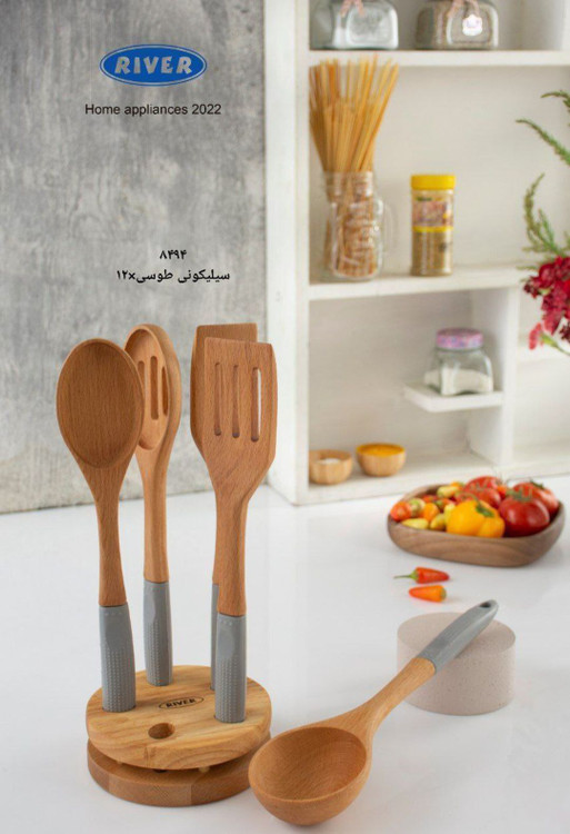 ست کفگیر ملاقه چوبی دسته سیلیکونی محصول شرکت ریور بسیار محکم و با دوام ساخته شده از چوب بامبو در دو رنگ کرب و طوسی موجود است